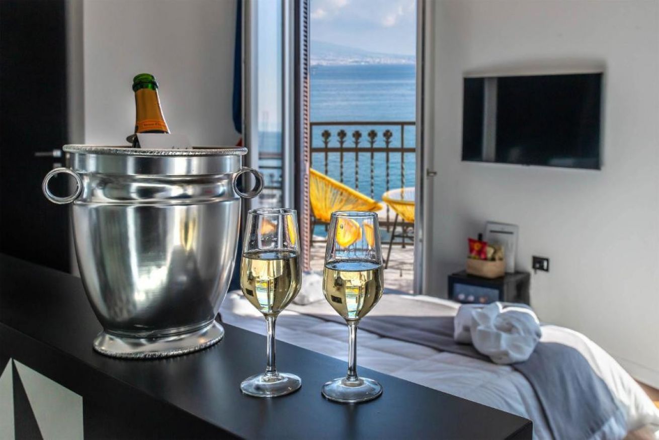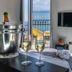 Moderna Suite climatizzata dotata di balcone con vista fronte mare, area salotto, TV a schermo piatto, vasca esterna, bagno privato con asciugacapelli e set di cortesia e connessione Wi-Fi gratuita.